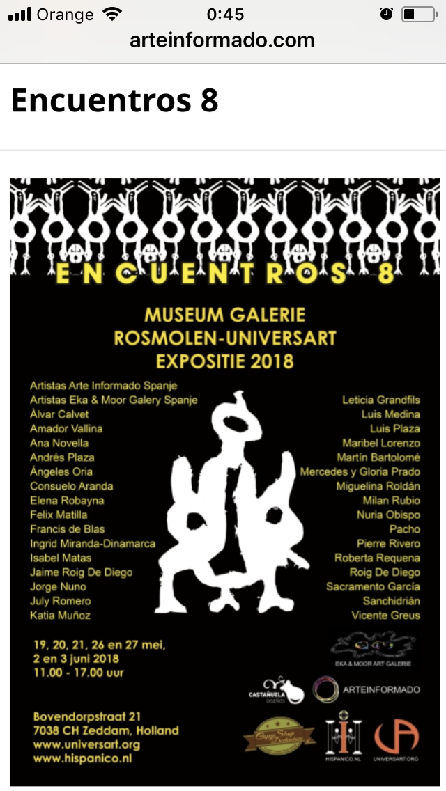 Mayo- junio- Participo en Encuentros 8 - Expositie  2018.  Museum  Galerie  Rosmolen Universart en Zeddam, Holanda.   Cartel